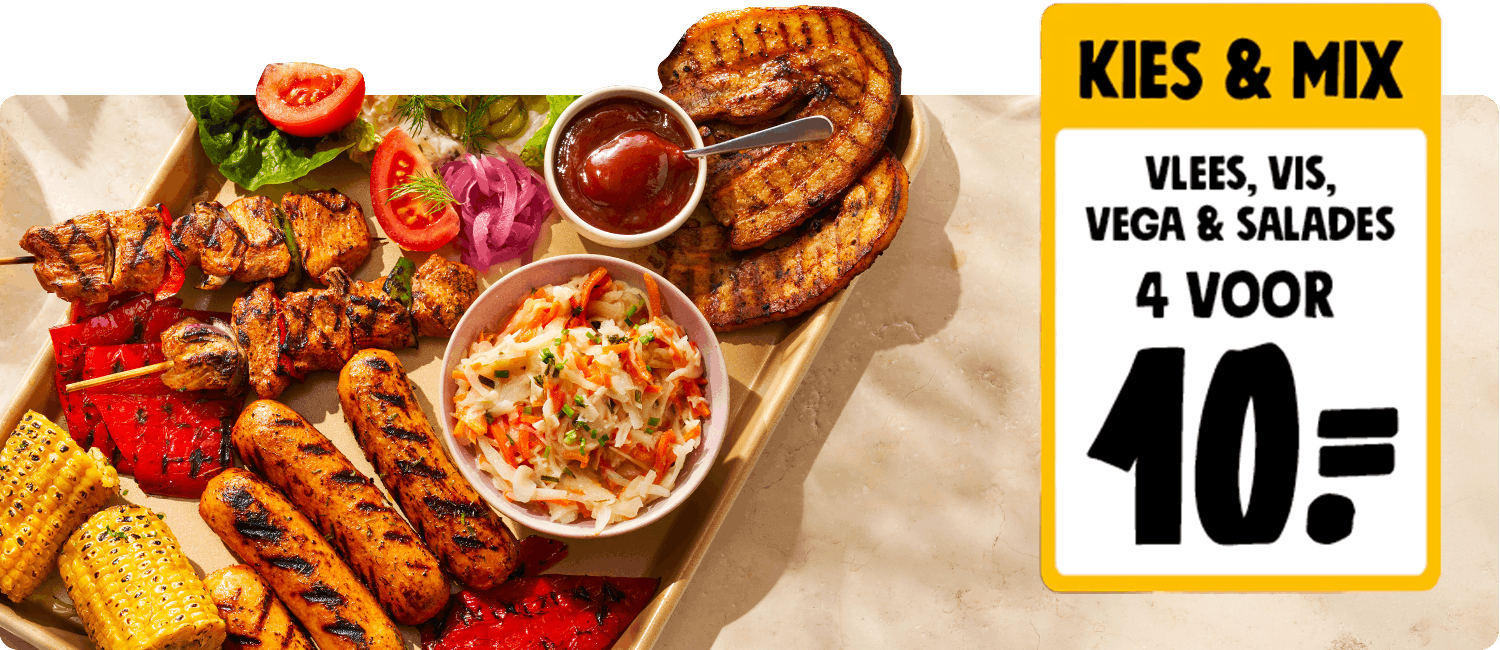 Rol die BBQ gerust wat vaker naar buiten. Want met Kies & Mix BBQ grill jij het hele seizoen voordelig: meer dan 30 soorten vlees, vis, vega en salades zijn 4 voor € 10.