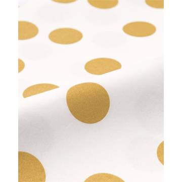 Papieren tafelkleed met goudkleurige stippen van 220x138 cm. Ideaal voor snelle feestdecoratie en makkelijk opruimen.