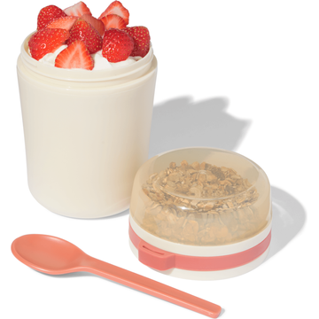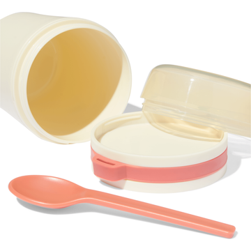 Beige yoghurtbeker-to-go van dubbelwandig kunststof met 420ml inhoud. Met lekvrije draaidop, lepel en compartiment voor muesli of fruit.